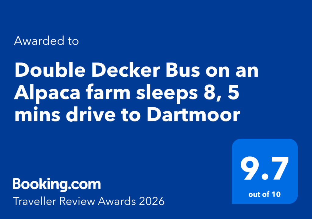 A London Double Decker bus nestled in the peaceful corner of a field of Alpacas , Dartmoor 2 miles away , beaches close by. Very spacious inside with fridge/freezer , Gas hob , Lounge area complete with books and games, Cutlery , plates , linen all included.